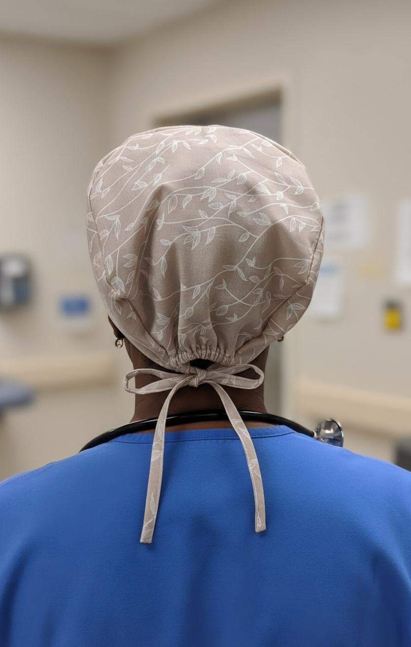 Sublimez votre quotidien au bloc opératoire avec le calot Feuillage d’Hiver, une création artisanale signée Les Coutures de Miette.
